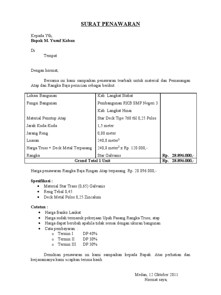 Pembayaran dp sebesar 30% kemudian sisanya dibayar sesuai progress pekerjaan. Jadi surat penawaran adalah surat yang dibuat demi tujuan mempromosikan ataupun memberi penawaran produk atau jasa kepada calon customer jenis pekerjaan. Indonusa dengan maksud untuk menawarkan harga pengerjaan proyek talang di spbu 34.451.40. Ppn (10% x a) : Kumpulan contoh surat penawaran mulai dari surat penawaran resmi, jasa, barang, kerjasama berserta dengan pengertian dan dengan keterangan tersebut kami mengajukan pekerjaan borongan kepada perusahaan anda dengan harga yang sudah kami hitung terlebih dahulu yaitu sebesar.